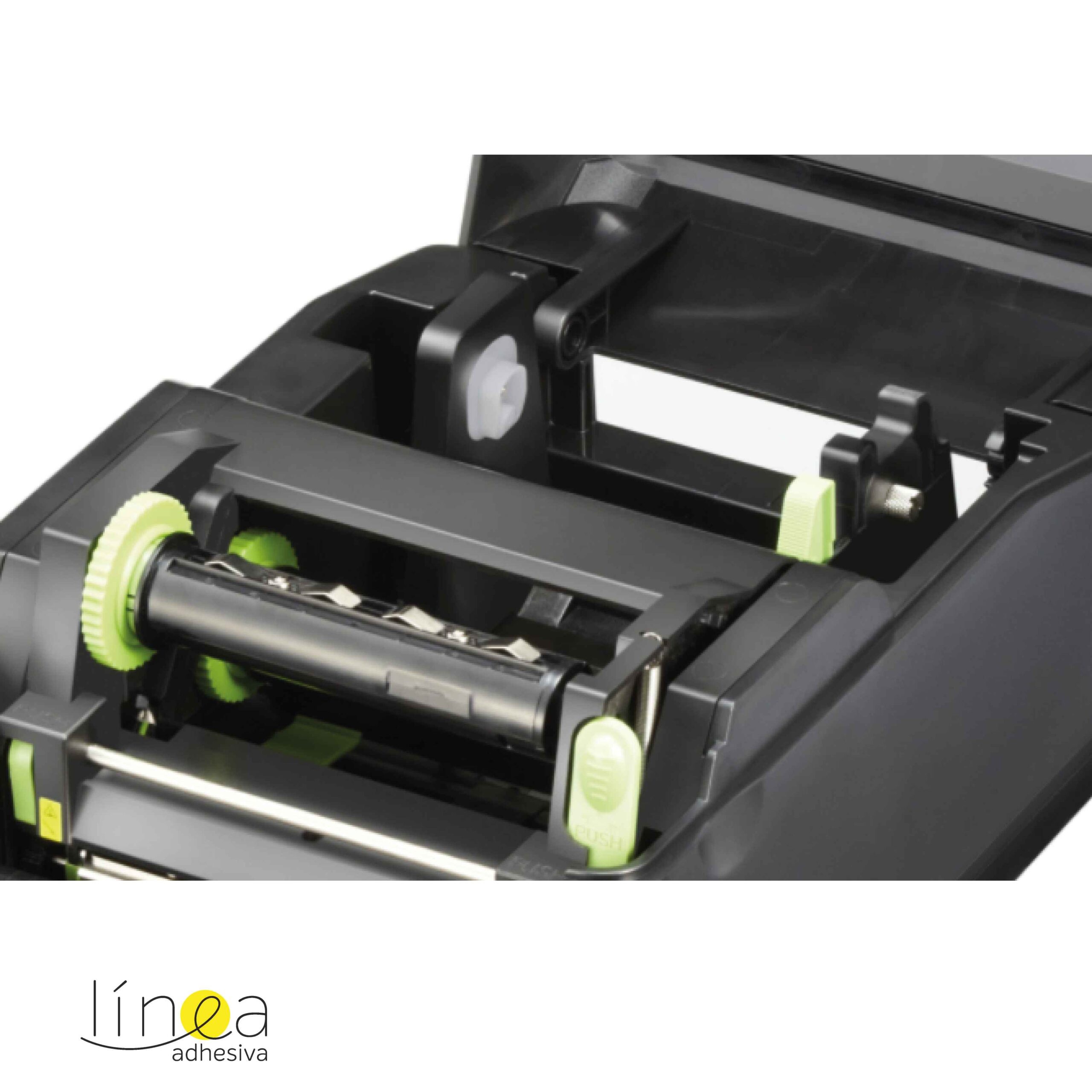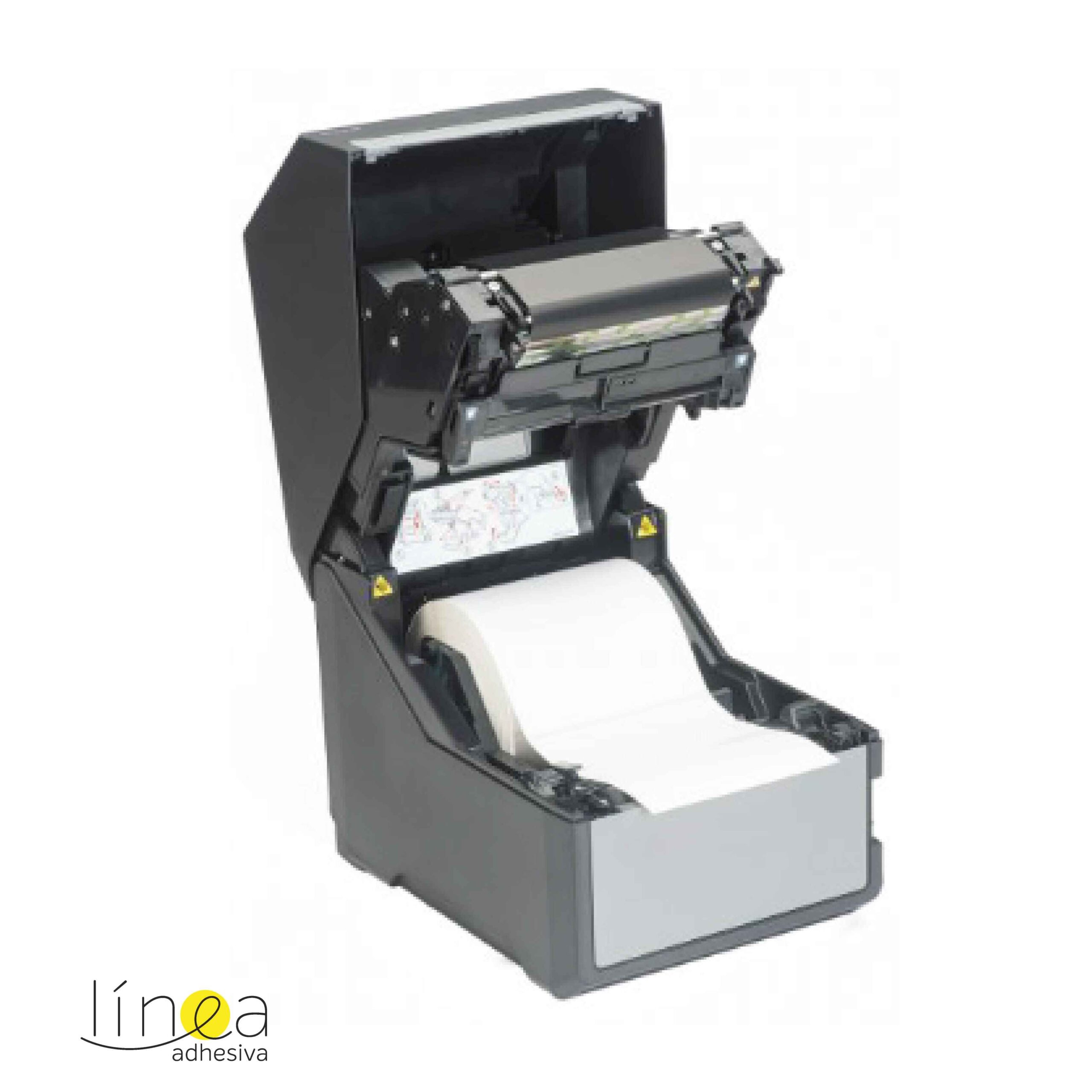 Impresora de escritorio, apta para impresión de materiales térmicos y de transferencia térmica.
